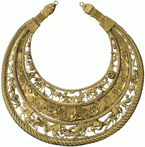 Таким же образом оформлялись наиболее подходящие для превращения в ювелирные изделия косточки съеденных животных или красивые деревянные палочки, достойные преобразования в украшение-амулет, а также те камни, твердость которых позволяла нанести на них узор, еще далекий до орнамента в привычном для нас понимании этого слова. Из всего того, в чем можно было проколоть, просверлить или пробить дырочку, изготовлялись бусы. Их изобилие также приветствовалось.